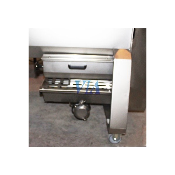 Trituradora destemmer en acer inoxidable sense bomba de transferència. La cistella és un sistema professional antilacament. L'eix destil·lant està proveït de puntes de goma. Sistema de trituració amb corró regulable. La maquinària està dotada d'un tanc de recollida de most, equipat amb un cargol de mescla i connexió per a la bomba.