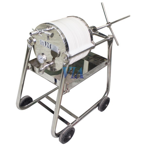 Filtre de plaques CL10 Model Cristalinox muntat amb plaques 310 mm de diàmetre per dur a terme tasques de filtració inicial de desbast, clarificació, abrillantat i esterilització de tot tipus de líquids industrials o alimentaris.