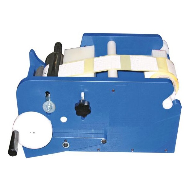 Etiquetadora manual amb volant. Per recipients cilíndrics amb diàmetre d'entre 50 mm i 120 mm.