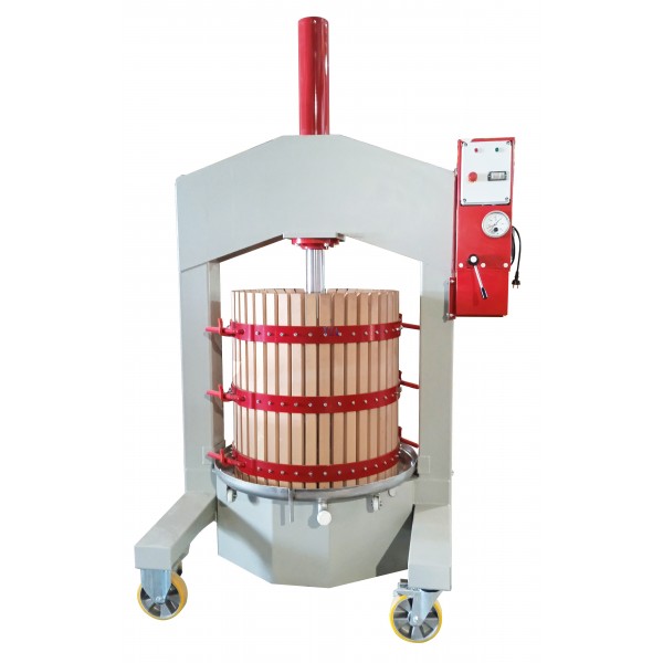 Premsa hidràulica reforçada, funcionament de motor elèctric. D'aplicació en l'extracció de mostos de raïms vermelles fermentades i vins delicats de raïms blancs.