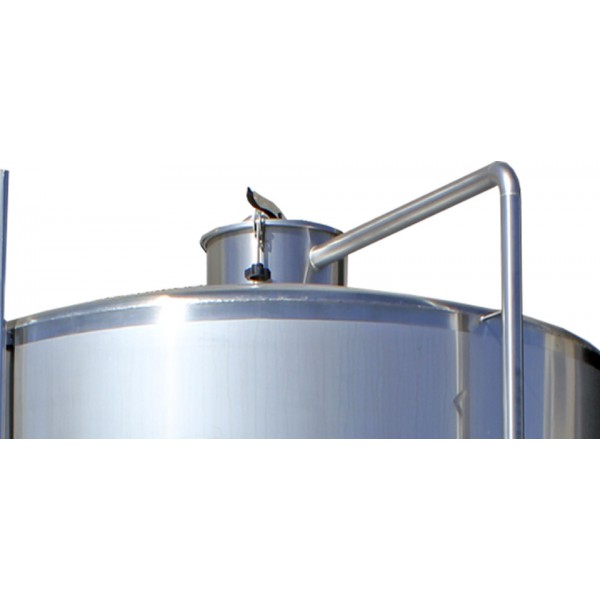 DETALL * Part superior: Cúpula cònica de 45º centrada, boca d'accés centrada diàmetre 400 mm amb junta, tapa, volant i sistema d'obertura amb braç i pern giratori. Vàlvula de seguretat de doble efecte (pressió / depressió) en inox 304. * Cilindre: nivell complet amb aixeta inox 304 rosca gas amb mànega de plàstic, amb perfil calibrat de capacitat general.