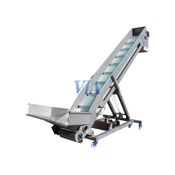 Stainless steel elevator belts with wheels, height adjustment by means of a manually operated hydraulic piston, belt speed variator option.