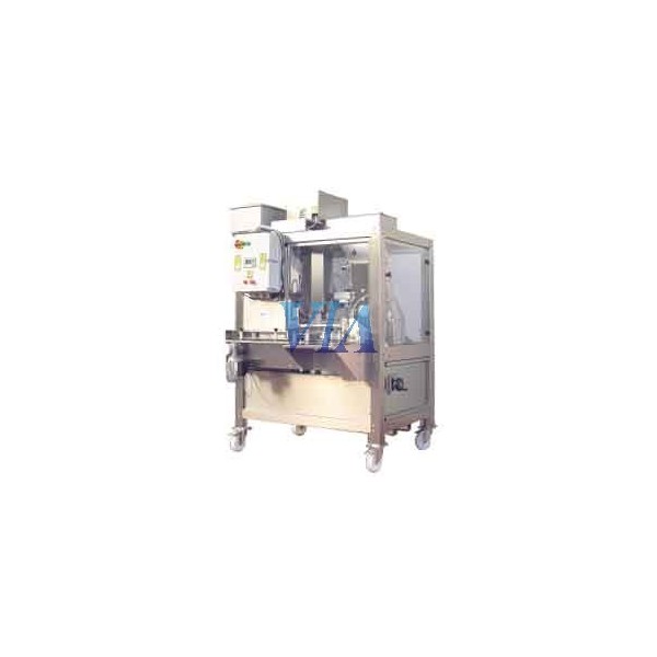 Fabricado en acero inoxidable, y consta de una estación de llenado y una estación de taponado con distribuidor automático.