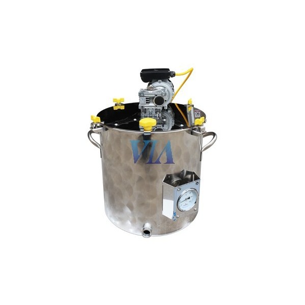 The thick bottom is designed to maintain proper temperatures during processing and prevent caramelization, even without insulation. The thick lid is reinforced with stainless steel hooks, the 35 liter steel mash pot motor produces 220 volts. It includes the geared motor, the blades, the 3/4” steel tap, the 3/4” threaded bushing for the connection of the tap and the entry of the thermometer probe.