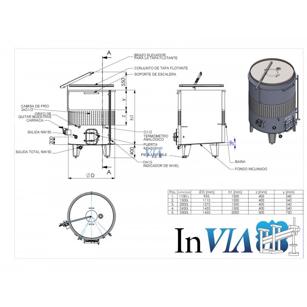 *Cylinder: Support for the rope collection winch, facilitating the lifting and lowering of the cover. kit always full complete. Complete level DN15 thread with 304l stainless steel tap with DN15 plastic hose, with general capacity calibrated profile. Characteristics and identification plate. Support stairs. Application outlet Faucet takes samples in stainless steel cap DN15. Rectangular lower mouth 430x310 with exterior opening, complete with gasket, closing wheel and bolts. Thermometer holder ½” on the front, another on the back for a probe.