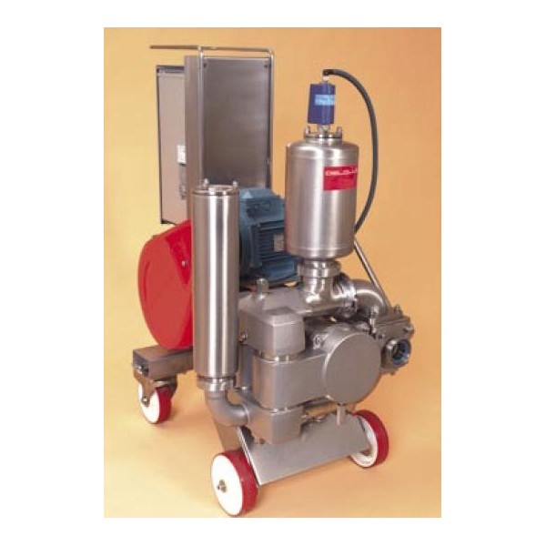 Self-priming horizontal piston pump for clean liquids or particles in suspension.