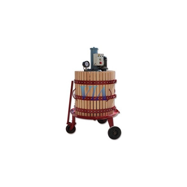 - Motorized hydraulic press 80x05 with collection tank in carbon steel. With car and wooden cage.