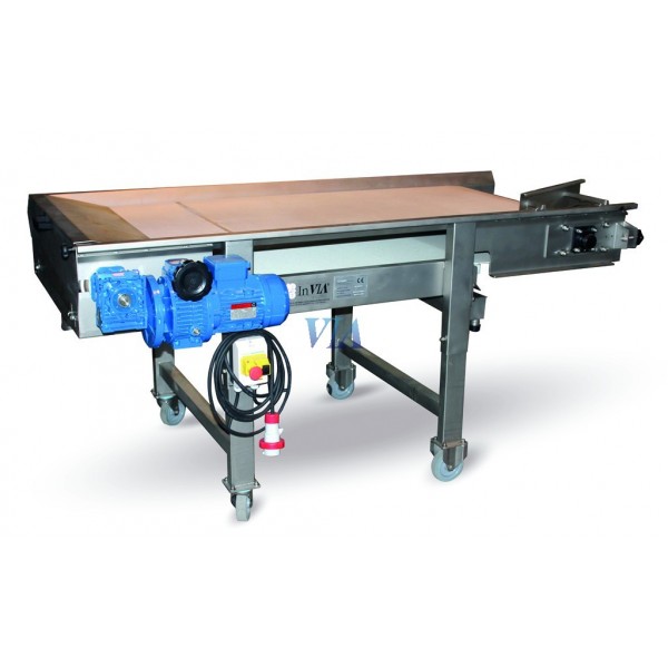 Constructed in AISI 304 stainless steel with 380 V motor reducer 0.75 kW and mechanical speed variator, PVC band for food use, equipped with wheels (2 fixed and 2 swivel with brake).