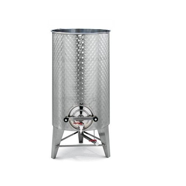 200-liter cylindrical tank with a conical bottom with a 300 mm round INOX lower mouth equipped with a steel door with a food seal and chrome-plated brass taps. Lower outlet for total emptying. INOX welded box legs