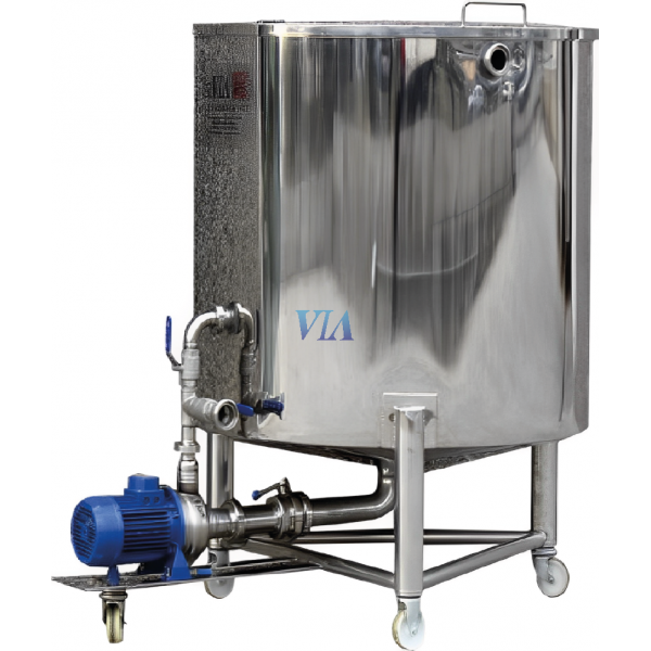 Equipment consisting of stainless steel tank, lower pump, total drain valve, mounted on wheels, upper liquid inlet.