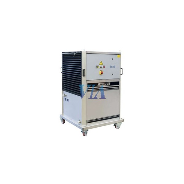 Direct cooling unit available in various sizes and capacities. It consists of a refrigeration unit at the top and a heat exchanger at the bottom. It is manufactured on a mobile stainless steel chassis equipped with wheels.