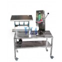 Mesa Inox doble bandeja (largo, ancho, alto) 3000 x 1250 x 800 mm , montada sobre ruedas con llenadora 4 años con bomba y sonda de máximo - mínimo + tapadora corchos de accionamiento neumático con dispensador automático de tapones. Llenado de botellas de: 0,5 a 2l. Rendimiento aproximado: 150 l/h. OTRAS...