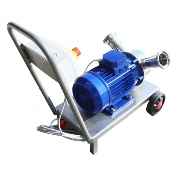 Bomba autoaspirante, reversible, cuerpo en inox, Rodete flexible de goma o nitrilo. Motor trifásico, montadas sobre carro inox (incluido).