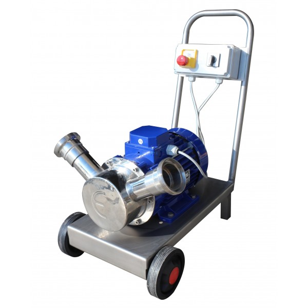 Bomba autoaspirante, reversible, cuerpo en inox, Rodete flexible de goma o nitrilo. Motor trifásico, montadas sobre carro inox (incluido).