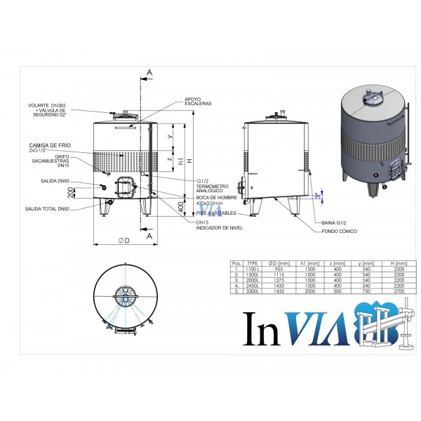 DETALLE *Parte superior: Cúpula cónica de 45º centrada, boca de acceso centrada diámetro 400mm con junta, tapa, volante y sistema de apertura con brazo y perno giratorio. Válvula de seguridad de doble efecto (presión / depresión) en inox 304l.*Cilindro: nivel completo con grifo inox 304l rosca DN15 con manguera de plástico D16mm, con perfil calibrado de capacidad general. Placa de características y identificación. Apoya escaleras. Salida aplicación grifo toma muestras en inox. Tapón DN15. Boca inferior rectangular 430x310 con apertura exterior, completa con junta, volante de cierre y pernos. Vaina porta termómetros ½” frontal, otra posterior para sonda. Camisa de intercambio térmico envolvente con racord 1” gas. Rosca posterior con tapón para sonda PT100. Rejilla colador interior con salida exterior válvula mariposa con macho NW 50 para facilitar el remontado y retención de los hollejos. *Parte inferior: Fondo plano inclinado 5% con pendiente hacia la parte frontal para facilitar el desvinado y la extracción de los hollejos. Salida del vaciado total al lado de la boca inferior en el fondo válvula mariposa inox 304 salida macho NW 50. Pies troncocónicos con tuerca y pernos regulables para una perfecta alineación (+ / - 60mm). Con platinas de soporte en suelo inox diámetro 140mm.