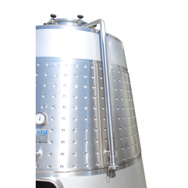 *Parte inferior: Fondo plano inclinado 5% con pendiente hacia la parte frontal para facilitar el desvinado y la extracción de los hollejos. Salida del vaciado total con codo al lado de la boca inferior en el fondo válvula mariposa inox 304 salida macho NW 50. Pies cilindricos con tuerca y pernos regulables para una perfecta alineación (+ / - 60mm). Con platinas de soporte en suelo inox diámetro 140mm.
