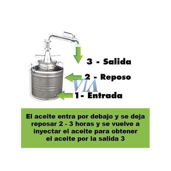 Depósito decantador de aceite de oliva virgen extra, necesario en la elaboración del aceite en la almazara artesanal o cualquier otro proceso de decantación de pequeñas cantidades de fluidos de distinta densid