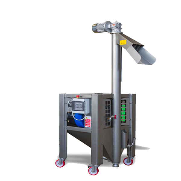 Posteriormente, dispone de un elevador para transportar las aceitunas deshojadas y limpias al molino.