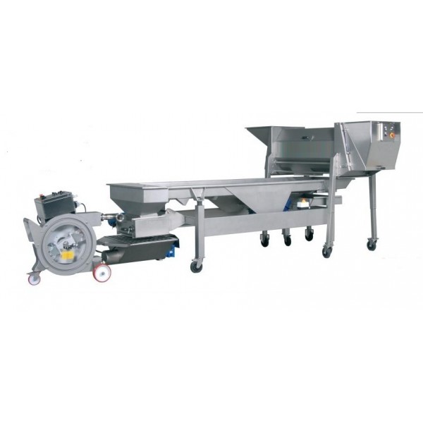 Construida  totalmente en acero inoxidable AISI 304, montada sobre ruedas que facilitan su movilidad. Tolva de carga con fuerte inclinación  para ser alimentada mediante cinta elevadora, mesa de selección, tolva etc. Equipada con patas telescópicas  hacen que la máquina  pueda adquirir diferentes configuraciones dentro de una línea de procesado.