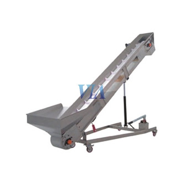 Cintas elevadoras de acero inoxidable con ruedas, regulación de altura por medio de pistón hidráulico de accionamiento manual o mediante polipastro eléctrico, opción variador de la velocidad de la cinta.