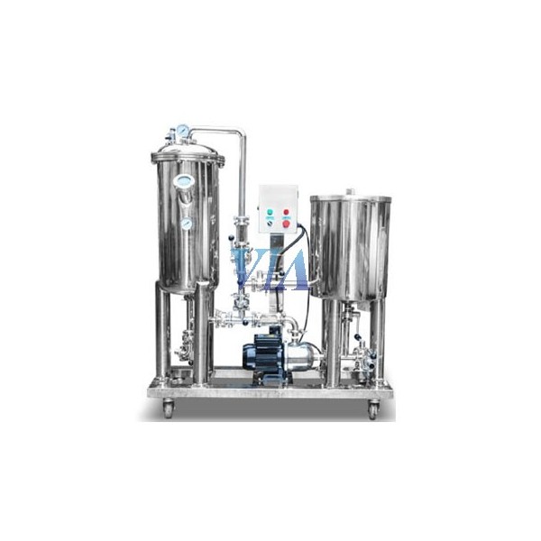 Filtro de vela con tierra de diatomeas diseñado para pequeñas partidas de vinos especiales en filtración desbástate y clarificante sin la necesidad de las mermas (pérdidas) y uso exagerado de tierras filtrantes como sucede en los filtros de mayores capacidades. Dispone de una superficie de 0,3 y 1,4m2 para la filtración de vino, cerveza, sidra… con dosificador y fácil lavado interno. Caudal de producto recomendado 200 y 1.000 litros por hora. El filtro de vela está montado sobre un marco rígido provisto de ruedas giratorias para facilitar su reubicación. Se utiliza en la filtración utilizando el consumible aluvial (tierra de diatomeas) para las velas de filtro verticales. El filtro está equipado con una bomba que en la filtración va circulando con la dosificación de tierras de diatomeas en dosis regulares, lo que garantiza un rendimiento continuo de las velas del filtro. Para la inspección visual hay mirilla del filtrado dentro de los componentes del filtro, más importantes del filtro están equipados con un visor de flujo. El contenedor de las velas de filtro está construido con bridas de presión PN10 para un fácil desmontaje.
