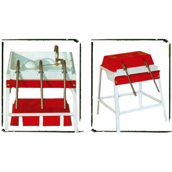 Con pequeño depósito superior plástico y sistema de boya que regula el suministro de líquido a la máquina.