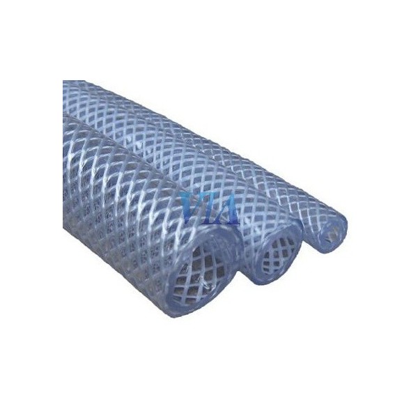 Manguera fabricada por extrusión de compuestos vinílicos, reforzada en su interior con malla de hilos de poliéster de alta resistencia.