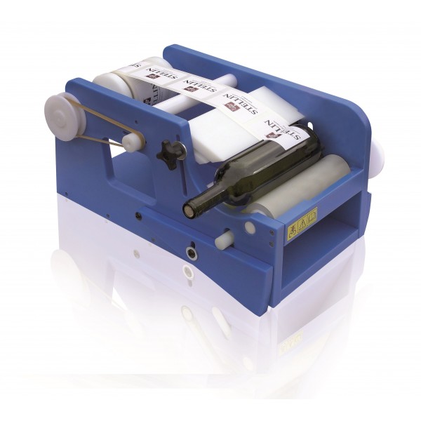 Etiquetadora manual con volante. Para recipientes cilíndricos con diámetro de entre 50 mm y 120 mm.