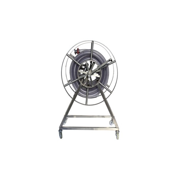 Carro acero INOX para recoger las mangueras de forma fácil. Manivela inox de recogida, montado sobre cuatro ruedas con freno. Para mangueras de cualquier medida.