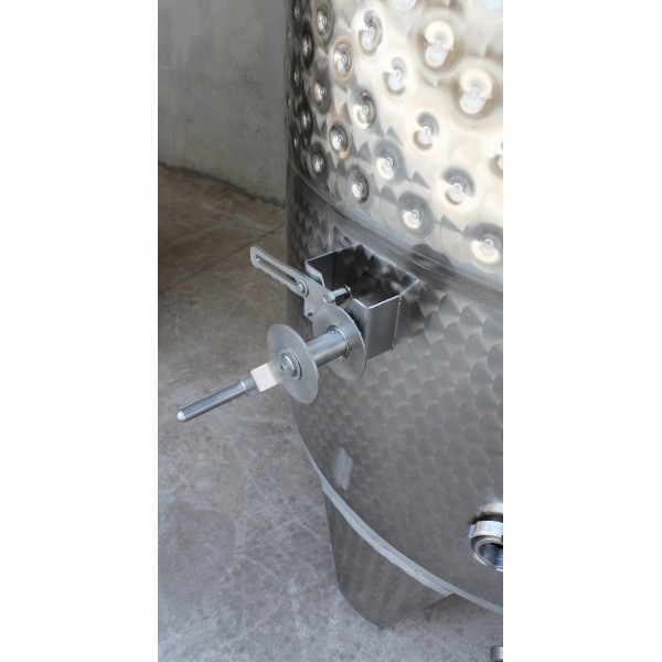Enveloppe d'échange de chaleur Surround avec raccord de gaz de 1". Filetage arrière avec capuchon pour sonde PT100. Grille crépine interne avec sortie externe vanne papillon mâle NW 50 pour faciliter les remontages et la rétention des peaux. *Partie inférieure : Fond plat incliné de 5% avec une pente vers l'avant pour faciliter le déveinage et l'extraction des peaux. Sortie de vidange totale à côté de la bouche inférieure en bas Vanne papillon inox 304 sortie mâle NW 50. Pieds tronconiques avec écrou et boulons réglables pour un alignement parfait (+ / - 60mm). Avec plaques de support au sol en acier inoxydable de 140 mm de diamètre.
