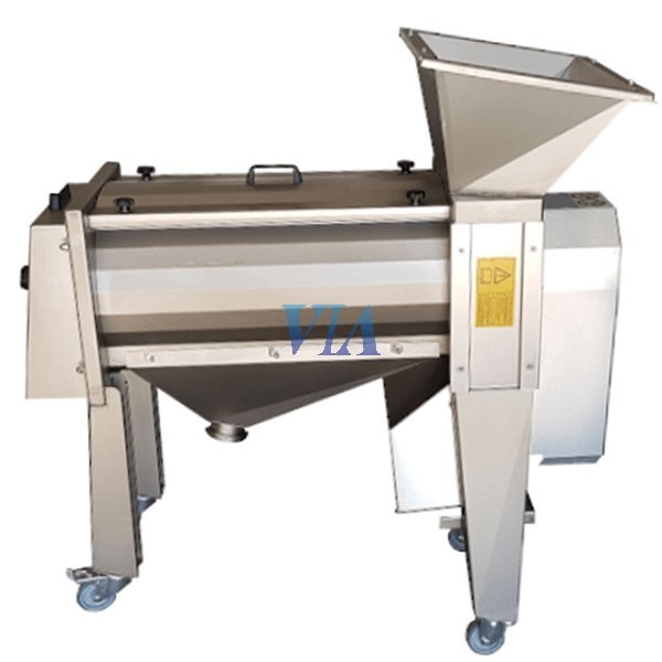 La trémie de chargement est équipée d'une vis de dosage et l'arbre interne est équipé de lames en caoutchouc réglables. Le déchargement de la partie non comestible (pierres, graines, peau) est effectué dans la partie avant de la machine, tandis que le déchargement du produit traité est effectué dans la partie inférieure avec un raccord DIN 80 pour le raccordement aux pompes d'aspiration.