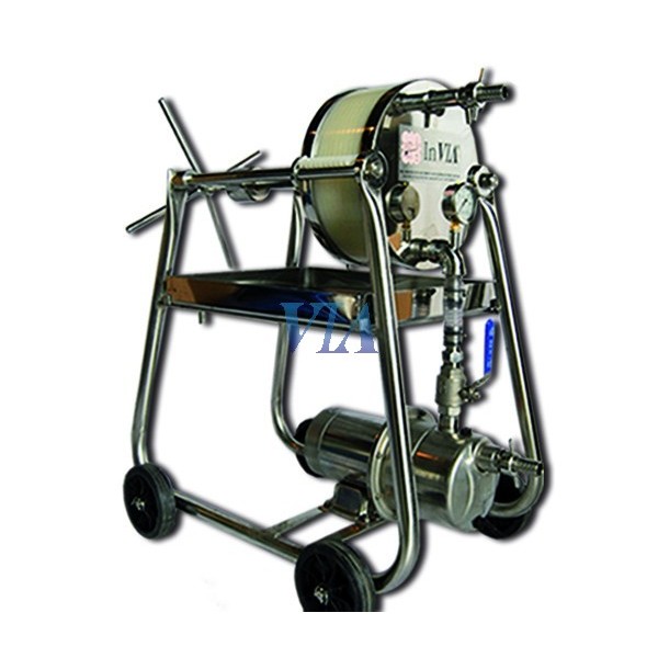 Filtre presse pour plaques filtrantes MOD 30. Cristalinox monté avec des plaques de 310 millimètres de diamètre pour effectuer des tâches du filtrage jusqu´à la stérilisation de tous les liquides industriels ou alimentaires.