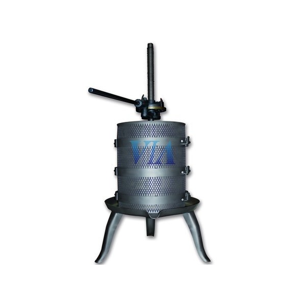 Presse verticale en acier inoxydable, fixée par des boulons.