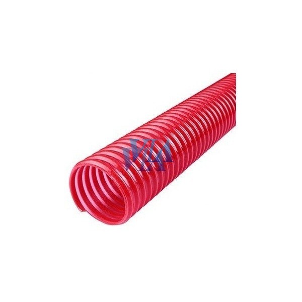 Tuyau fabriqué par extrusion de composés vinyliques, selon la norme UNE en ISO 3994 de couleur cristal violet transparent avec une spirale rouge.